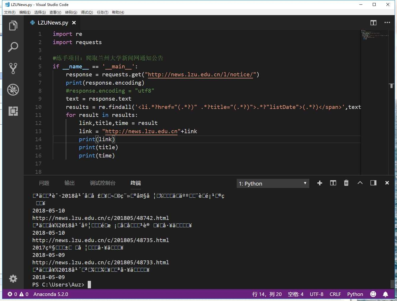 为什么我按照教程的方法写出来的代码输出后文字乱码?