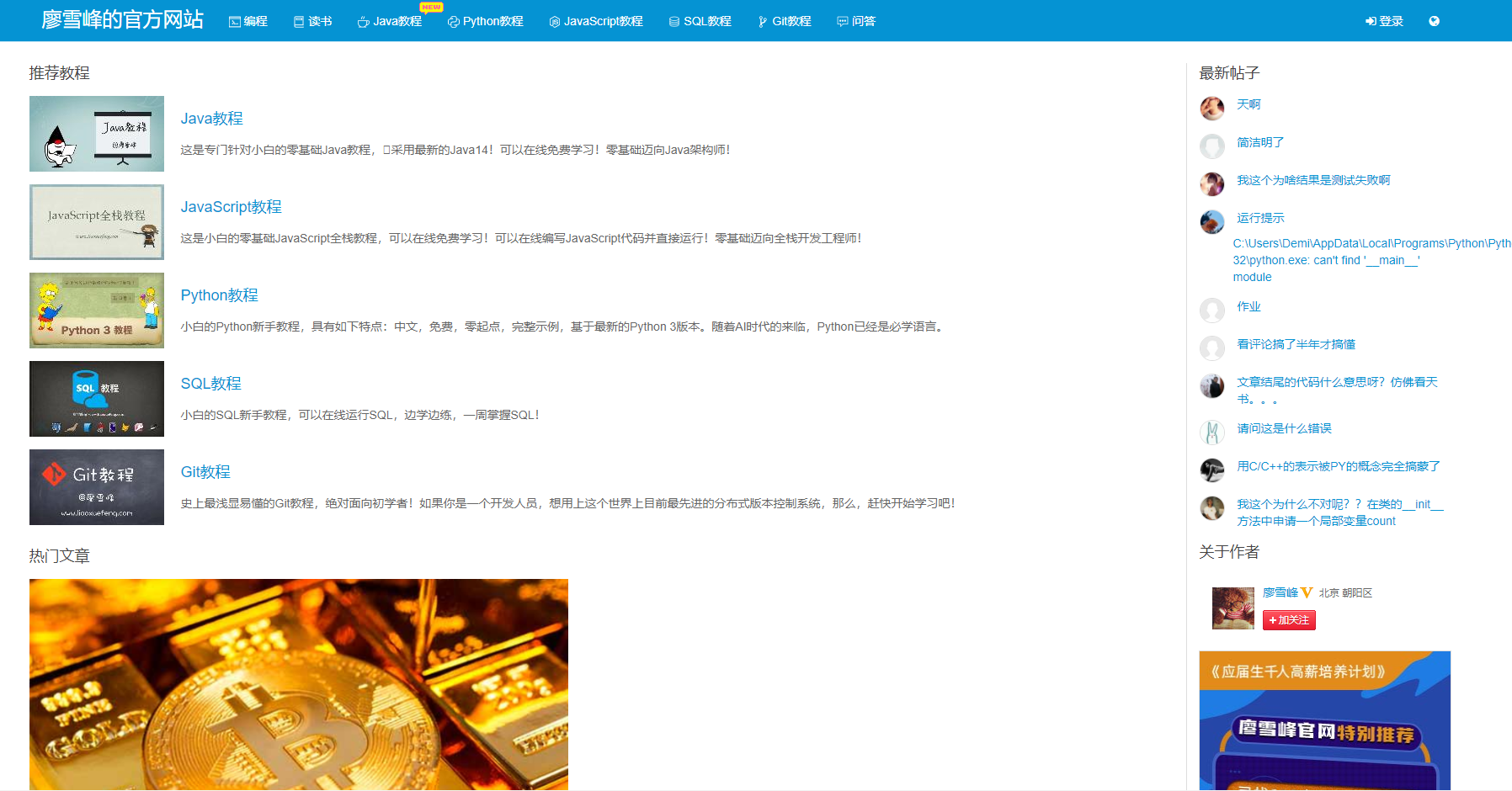 廖雪峰大神就不用介绍了吧,这个网站的很多教程也是很多小白入门的不错选择!