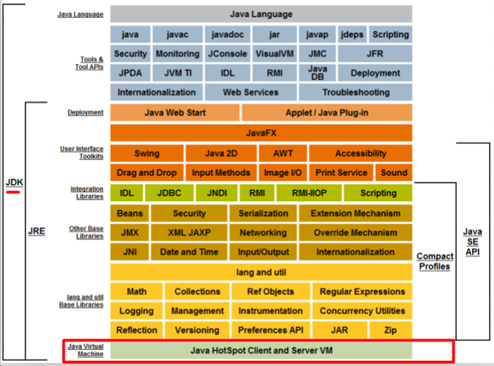 JRE(Java Runtime Environment):Java运行环境,如果要运行Java程序,就需要JRE的支持,JRE里包含JVM,一般在只运行程序而不开发程序的服务器中安装