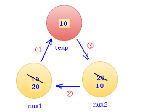把num1的值存储到临时变量temp中去把num2的值赋给num1变量把temp存储的值赋给num2变量