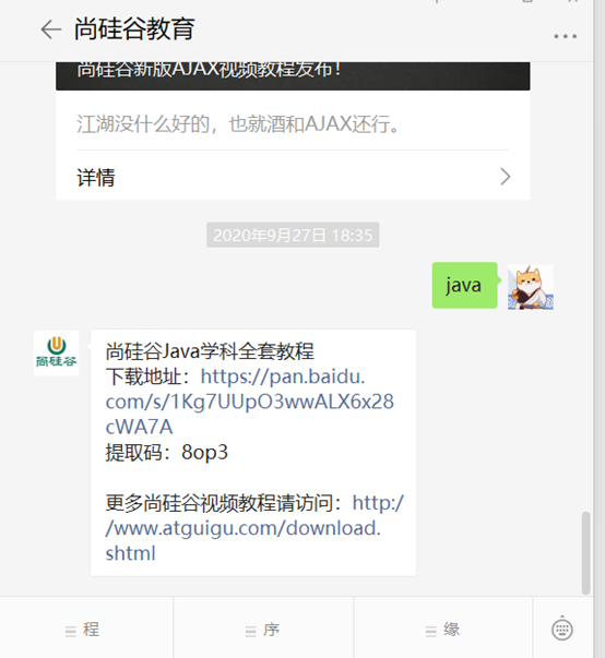 当然本人选择的是尚硅谷的,因为尚硅谷的资料比较齐全。你可以加尚硅谷的微信公众号回复(例如Java有给对应的资料)