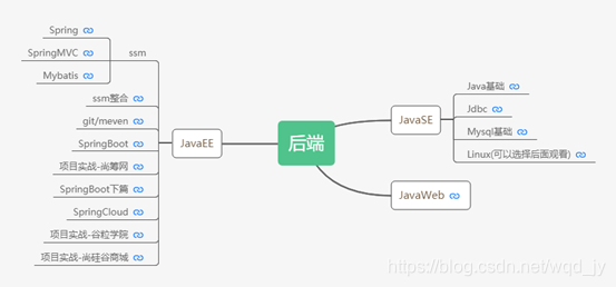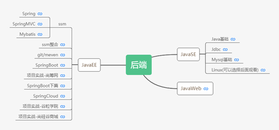 这个是本人画的思维导图,学习路线按照JavaSE->JavaWeb->JavaEE来进行。可以适当的多学习设计模式这一重要的知识点,因为要看Spring框架源码的话,在框架部分很多会用到设计模式的。