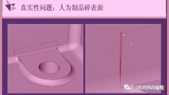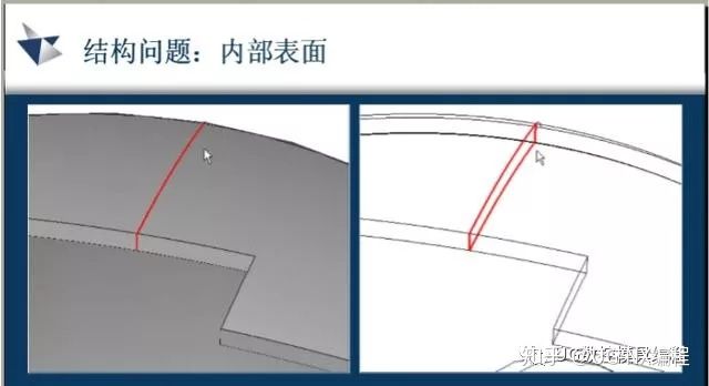 [这个就是突出了一个小曲面(红色部分),就会产生跳刀的行为,不仔细放大观察你就会感到不理解:怎么这里明明是个平面而为什么会跳刀呢?]当然还有其他的情况(有很多),我们就不一一列举了,在这里仅列出几例目的就是是大家明白,在做加工之前要对模型的质量进行一个检查,是非常重要的和必要的。