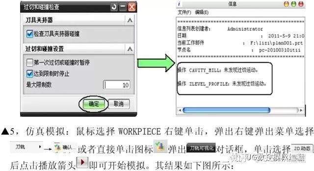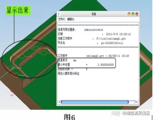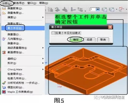 1*,打开一个模型文件 XLiziceliang2,并进入加工环境─→点击主菜单栏中“分析”→“最小半径”(如下图 5 所示),弹出最小半径对话框,框选整个工件后,点击确定或按下中键后退出对话框,显示为(下图 6)所示,在模型上显示出最小圆角部位,同时在信息对话框中显示出最小圆角半径值为 R=2.5。说明我们必须用小于直径 D=5 的刀具才能完全加工干净此工件。