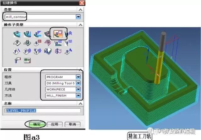 ▲1,首先创建加工所需的刀具:单击创建刀具图标 弹出 对话框,按 下图 a1 设置创建一把直径为 D=6mm 的平底刀。切换到刀具视图可以看到创建的刀具。