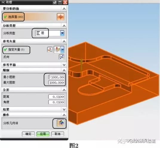 1*,鼠标左键点击“分析”→“NC 助理” (下图 1),弹出 NC 助理对话框(下图 2),选择分析类型为“层”、参考矢量为 ZC↑轴,点击“选择面”图标,此时选择了整个工件,工件高亮显示为红色。