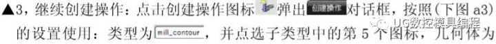 提示:在 UG8.0 中定义部件几何体与毛坯几何体时弹出的对话框,与之前的 版本不同即使是与它最接近的 7.5 版本也有所不同。之前的对话框样式为上 图 A3-1 所示。在新的版本中它默认的选择方式是“体”(因为一般情况下都 是选“体”),而如果选用其它方式时,如特征、曲面区域,单个曲面等,就需要先行点击列表中的“叉号” 进行切换——它不仅代表要删除已定义的几何体信息,还代表模式切换。2,创建操作并初步体验一下 UG 编程的基 本过程: