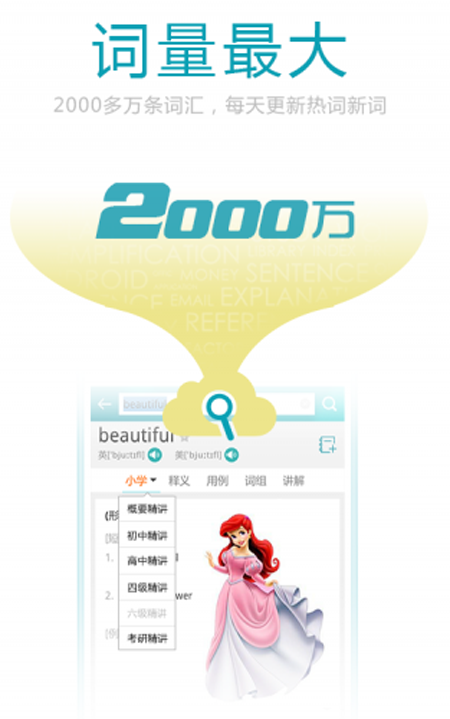 2、千万级词库:海词词典不仅涵盖初中英语词汇、高中英语词汇、四六级考试词汇、考研出国词汇、商务词汇等,而且各行各业、生僻词汇、新词热词等词汇一直在扩容整个词库,收录2000万词汇。