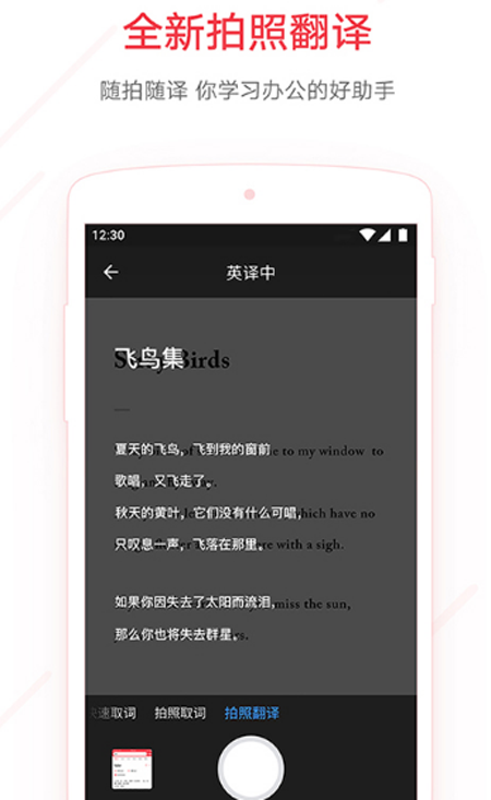 拍照翻译——强大的OCR摄像头取词和拍照翻译功能,一拍即译,无需手动输入便可快速翻译英语、日语等多种语言,满足出国旅游翻译、旅行购物翻译、英语学习翻译等需求。