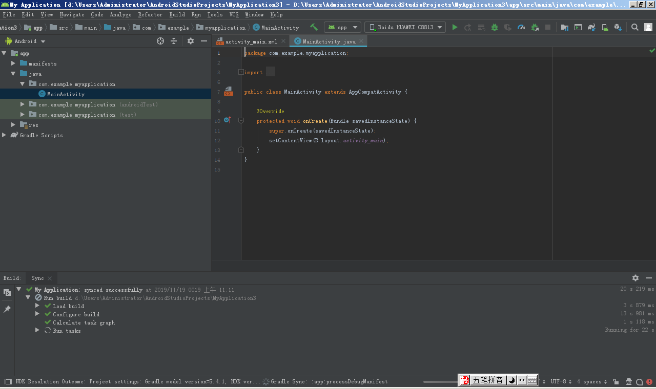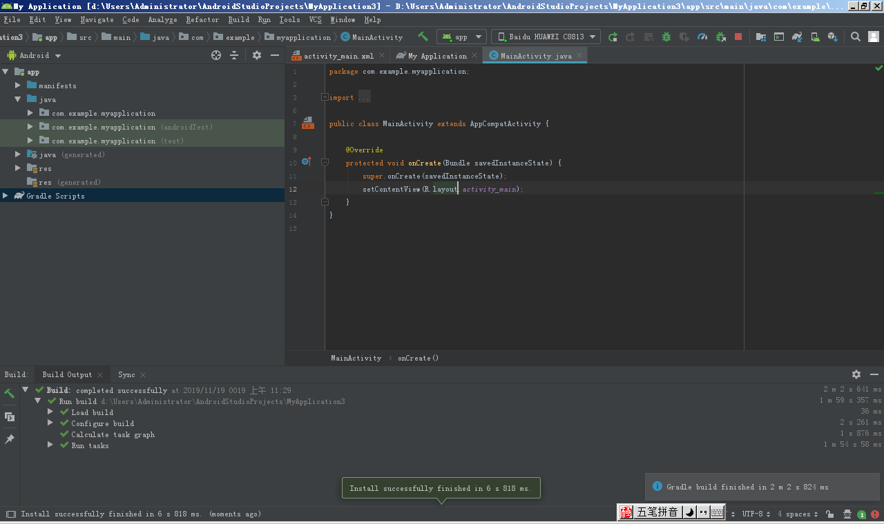现在不用做任何改动,点击那个绿三角-运行,耐心等特一会,注意AS最下面的状态提示,当出现:Install successfully finished in 6 s 818 ms. (5 minutes ago),你的手机现在也已经安装并运行了这个app了:Hello World!
