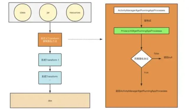通过遍历每个方法的字节码指令,判断是ActivityManager.getRunningAppProcesses这个方法调用,就替换成PrivacyUtil#getRunningAppProcesses调用,涉及到的字节码操作是比较基础的。