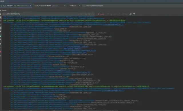 如图所示,运行时输出隐私方法调用堆栈的功能基本实现了,支持通过json配置需要hook的方法。