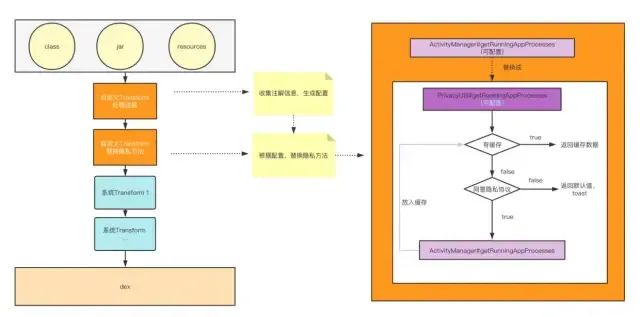 初级hook方案上一步我们通过自定义Transform可以拿到所有.class文件,后面只要通过ClassVistor和MethodVistor,可以分别拿到每个类和方法的字节码,以ActivityManager#getRunningAppProcesses为例,我们要替换成PrivacyUtil#getRunningAppProcesses,流程图如下: