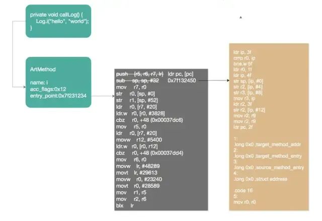 原理是通过修改ArtMethod的入口函数,把入口函数的前8个字节修改为一段跳转指令,跳转到执行hook操作的函数,原理跟阿里的热修复框架AndFix差不多,如下图所示。