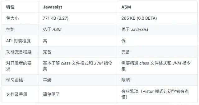 目前主流的字节码修改框架除了ASM,还有Javaassist,两者对比: