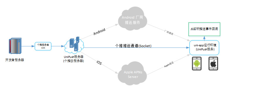前端拿到cid,一般是在登录成功后便将cid给后台,后端将cid和用户绑定,标识那个用户的app是那个,用于推送比如需要推一条消息给李四前端调接口将需要推送的信息发送给后端,后台拿到需要推送的信息,然后去用户表找到李四的cid,然后后端将消息发给个推的服务器个推的服务器拿到后,经过一顿猛操作将消息用不同的方式推送给app如果李四的app现在在使用,可能会走个推的专有通道将消息推送给app,如果李四的app离线,那就只有走厂商通道进行推送了,厂商的通道的配置官网里面也写了,个人去试了一下,就是需要将你的app发送到各大手机厂商的平台,申请流程个人感觉十分的繁琐。。。然后app接受到消息,如果后台使用普通的通知模板,那么unipush会自动给我们推送,然后会在通知栏弹出推送,如果后台使用透传的方式,unipush只负责传递消息,不会做其他的任何处理