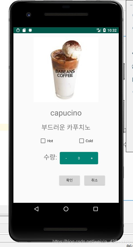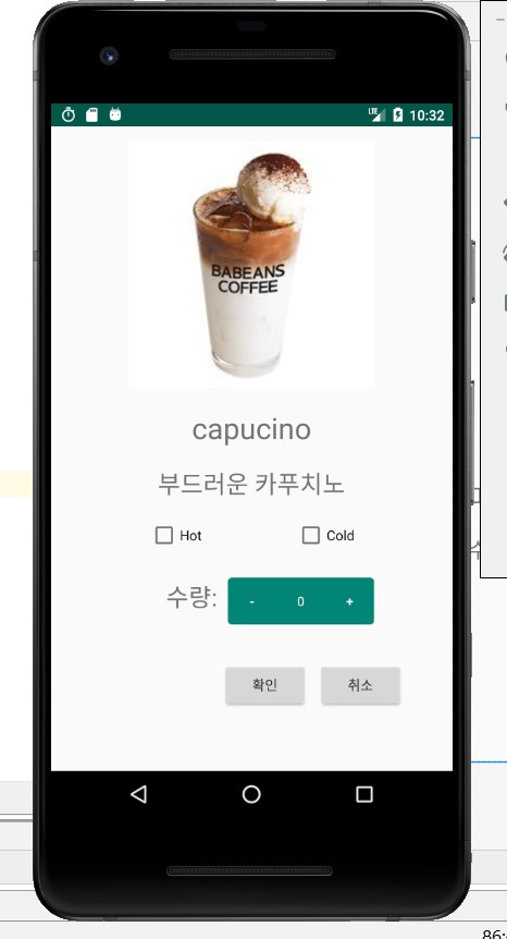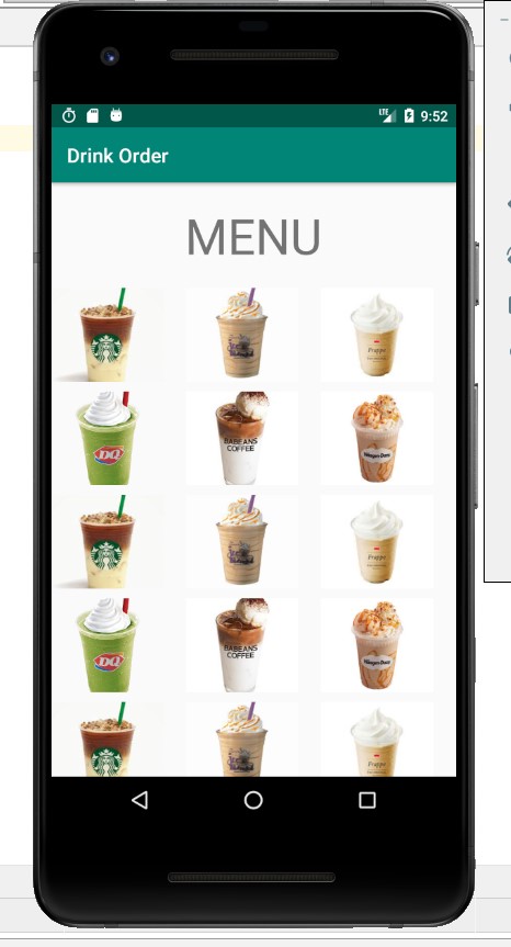 package com.example.myapplication; import android.app.Activity; import android.os.Bundle; import android.util.Log; import android.view.MotionEvent; import android.view.View; import android.widget.Button; import android.widget.ImageView; import android.widget.TextView; import android.widget.Toast; import com.cepheuen.elegantnumberbutton.view.ElegantNumberButton; import static android.widget.Toast.LENGTH_LONG; public class DrinkActivity extends Activity { public static final String EXTRA_DRINKNO ="drinkNo"; protected int count; protected void onCreate(Bundle savedInstanceState) { super.onCreate(savedInstanceState); setContentView(R.layout.drink_activity); int drinkNo=(Integer)getIntent().getExtras().get(EXTRA_DRINKNO); Drink drink=Drink.drinks[drinkNo]; ImageView photo=(ImageView)findViewById(R.id.photo); photo.setImageResource(drink.getImageResourceId()); photo.setContentDescription(drink.getName()); TextView name=(TextView)findViewById(R.id.name); name.setText(drink.getName()); TextView description=(TextView)findViewById(R.id.description); description.setText(drink.getDescription()); final ElegantNumberButton button_count=(ElegantNumberButton) findViewById(R.id.count_button); button_count.setOnClickListener(new ElegantNumberButton.OnClickListener() { @Override public void onClick(View view) { String num=button_count.getNumber(); Log.e("NUM",num); } }); Button button_correct=(Button)findViewById(R.id.button_correct); button_correct.setOnClickListener(new View.OnClickListener() { @Override public void onClick(View v) { Toast.makeText(DrinkActivity.this,"카드를 넣어주십시오", LENGTH_LONG).show(); } }); Button button_cancel=(Button)findViewById(R.id.button_cancel); button_cancel.setOnClickListener(new View.OnClickListener() { @Override public void onClick(View v) { finish(); } }); } }Drink.java