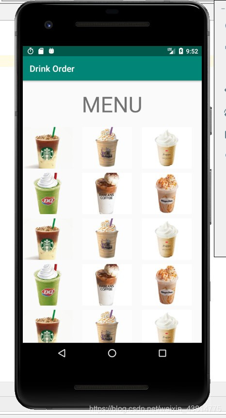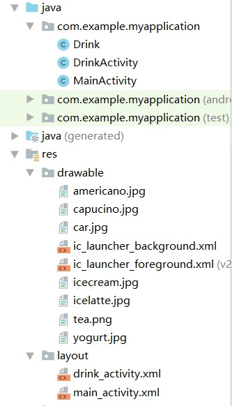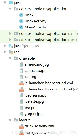 package com.example.myapplication; import androidx.appcompat.app.AppCompatActivity; import android.content.Intent; import android.os.Bundle; import android.view.View; import android.view.ViewGroup; import android.widget.AdapterView; import android.widget.BaseAdapter; import android.widget.GridView; import android.widget.ImageView; public class MainActivity extends AppCompatActivity implements AdapterView.OnItemClickListener{ int[] IMAGES={R.drawable.americano,R.drawable.icecream,R.drawable.yogurt,R.drawable.tea, R.drawable.capucino,R.drawable.icelatte,R.drawable.americano,R.drawable.icecream, R.drawable.yogurt,R.drawable.tea,R.drawable.capucino,R.drawable.icelatte, R.drawable.americano,R.drawable.icecream,R.drawable.yogurt,R.drawable.tea, R.drawable.capucino,R.drawable.icelatte}; @Override protected void onCreate(Bundle savedInstanceState) { super.onCreate(savedInstanceState); setContentView(R.layout.main_activity); GridView gridView=(GridView)findViewById(R.id.gridview); ImageAdapter imageAdapter=new ImageAdapter(); gridView.setAdapter(imageAdapter); gridView.setOnItemClickListener(this); } @Override public void onItemClick(AdapterView adapterView, View view, int i, long id) { Intent intent=new Intent(MainActivity.this,DrinkActivity.class); intent.putExtra(DrinkActivity.EXTRA_DRINKNO, i); startActivity(intent); } class ImageAdapter extends BaseAdapter{ @Override public int getCount() { return IMAGES.length; } @Override public Object getItem(int position) { return null; } @Override public long getItemId(int position) { return 0; } @Override public View getView(int i, View convertView, ViewGroup parent) { ImageView imageView =new ImageView(MainActivity.this); imageView.setLayoutParams(new GridView.LayoutParams(300,250)); imageView.setScaleType(ImageView.ScaleType.CENTER_CROP); imageView.setImageResource(IMAGES[i]); return imageView; } } } ****为了能在画面里显示出如下的图标,我们必须得添加library