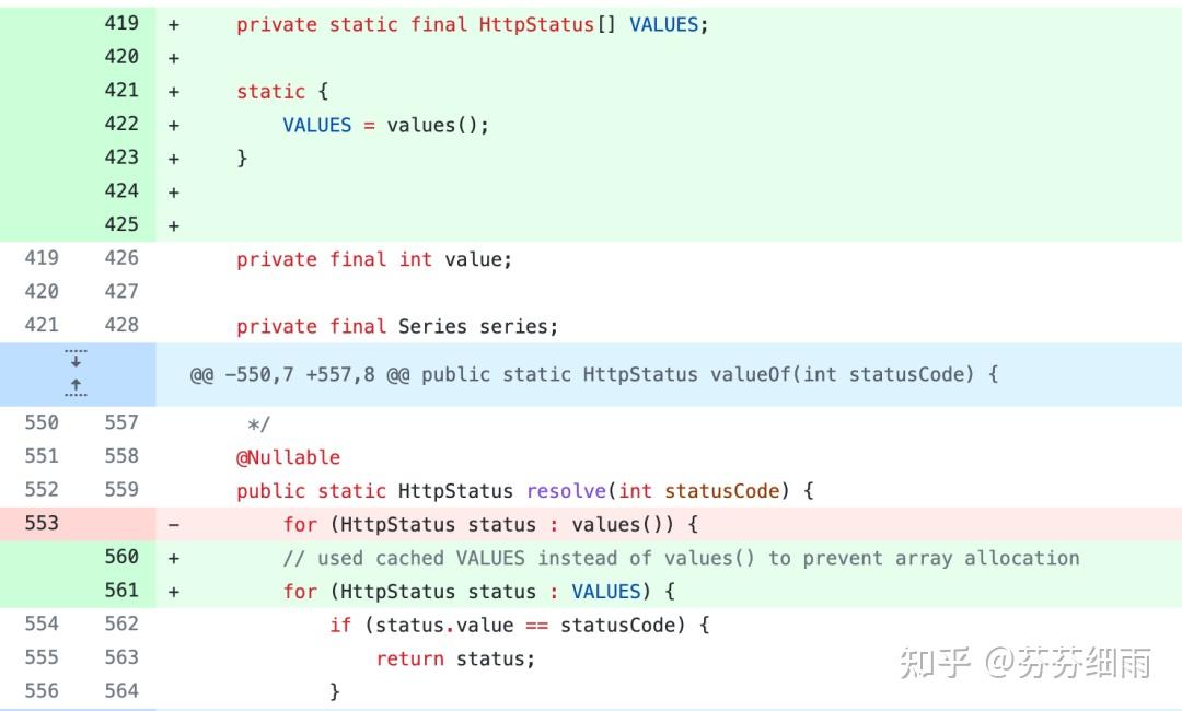 可能你会觉得这里使用 values() 缓存和直接使用 Enum.values() 的效率差异很小,其实在某些调用频率很高的场景下是有很大区别的,在 Spring 框架中,曾使用 Enum.values() 这种方式在每次响应时遍历 HTTP 状态码枚举类,这在请求量大时造成了不必要的性能开销,后来进行了 values() 缓存优化。