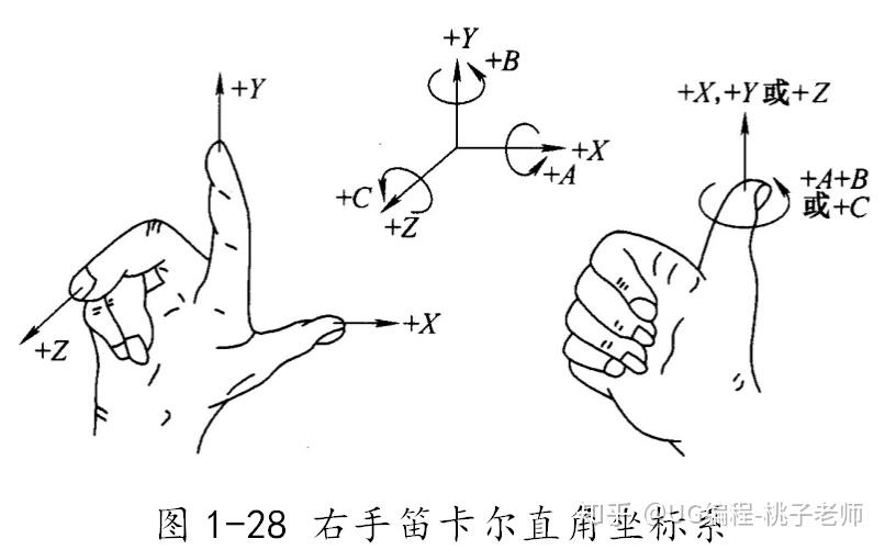 2.坐标系采用右手直角笛卡尔坐标系。如图1-28所示大拇指的方向为X轴的正方向,食指指向为Y轴的正方向,中指指向为Z轴的正方向。在确定了X、Y、Z坐标的基础上,根据右手螺旋法则,可以很方便地确定出A、B、C三个旋转坐标的方向。