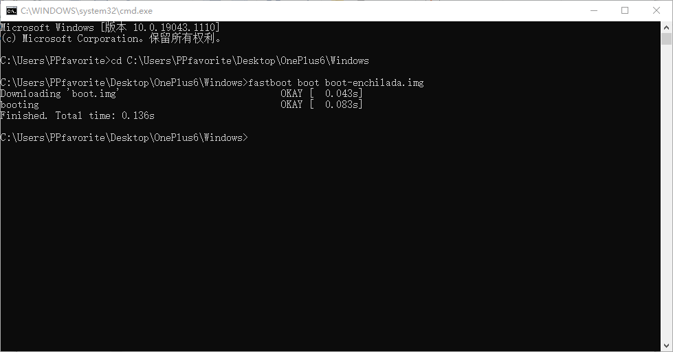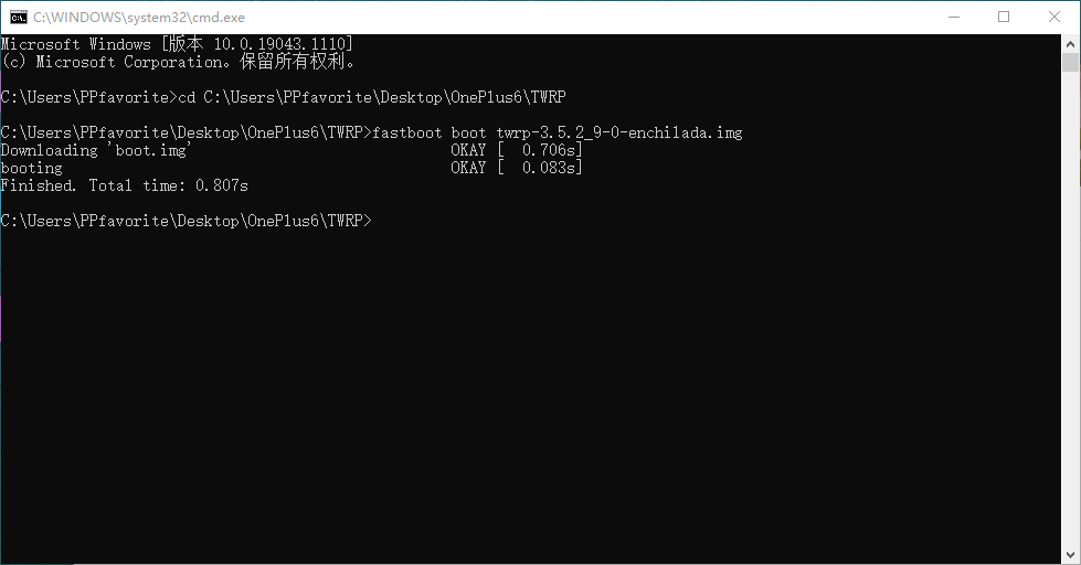 如我的twrp-3.5.2_9-0-enchilada.img文件储存在C:\Users\PPfavorite\Desktop\OnePlus6\TWRP处,则运行命令