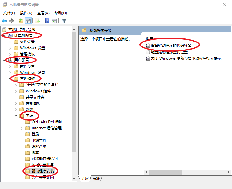 ②在本地组策略编辑器中,在左侧侧菜单栏找到“计算机配置-用户配置-管理模板-系统-驱动程序安装”,在右侧找到“设备驱动程序的代码签名”,双击打开