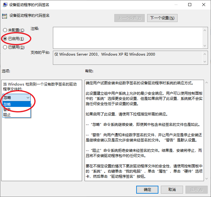 ③如图,在设备驱动程序的代码签名界面中,左上方选项切换到“已启用”,左下方选项切换到“忽略”,点击确定