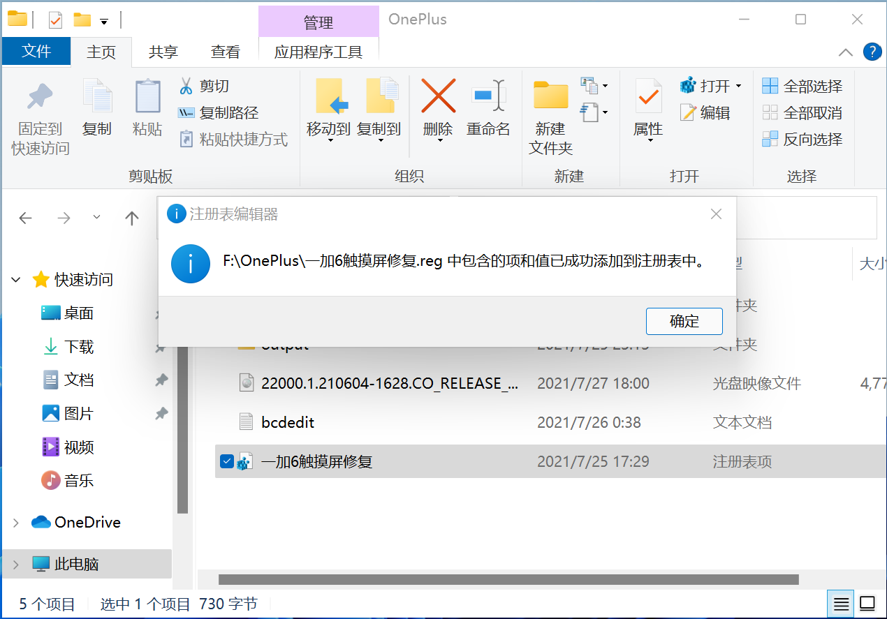 进入Windows系统后,双击一加6触摸屏修复.reg安装注册表,重启之后即可修复触屏偏移,如果无效请先将Windows更新到最新版本