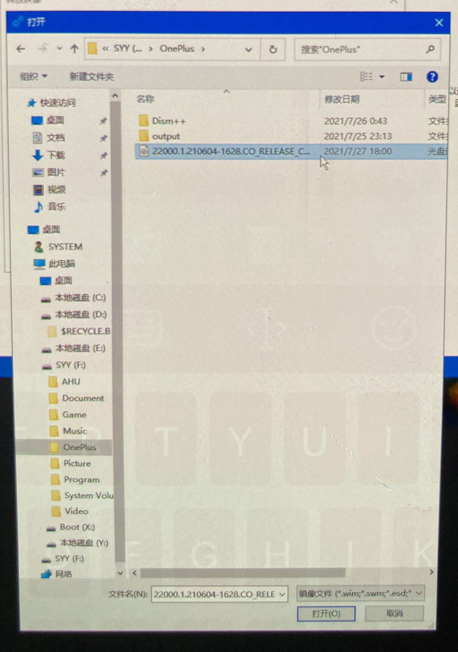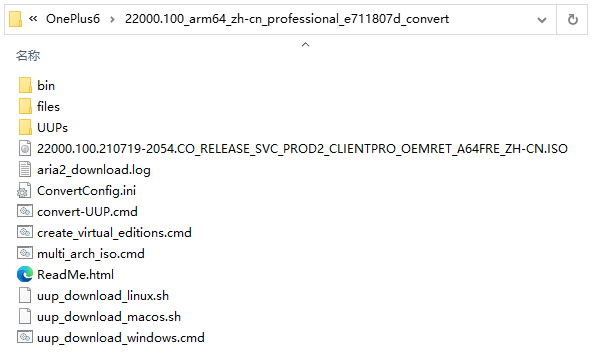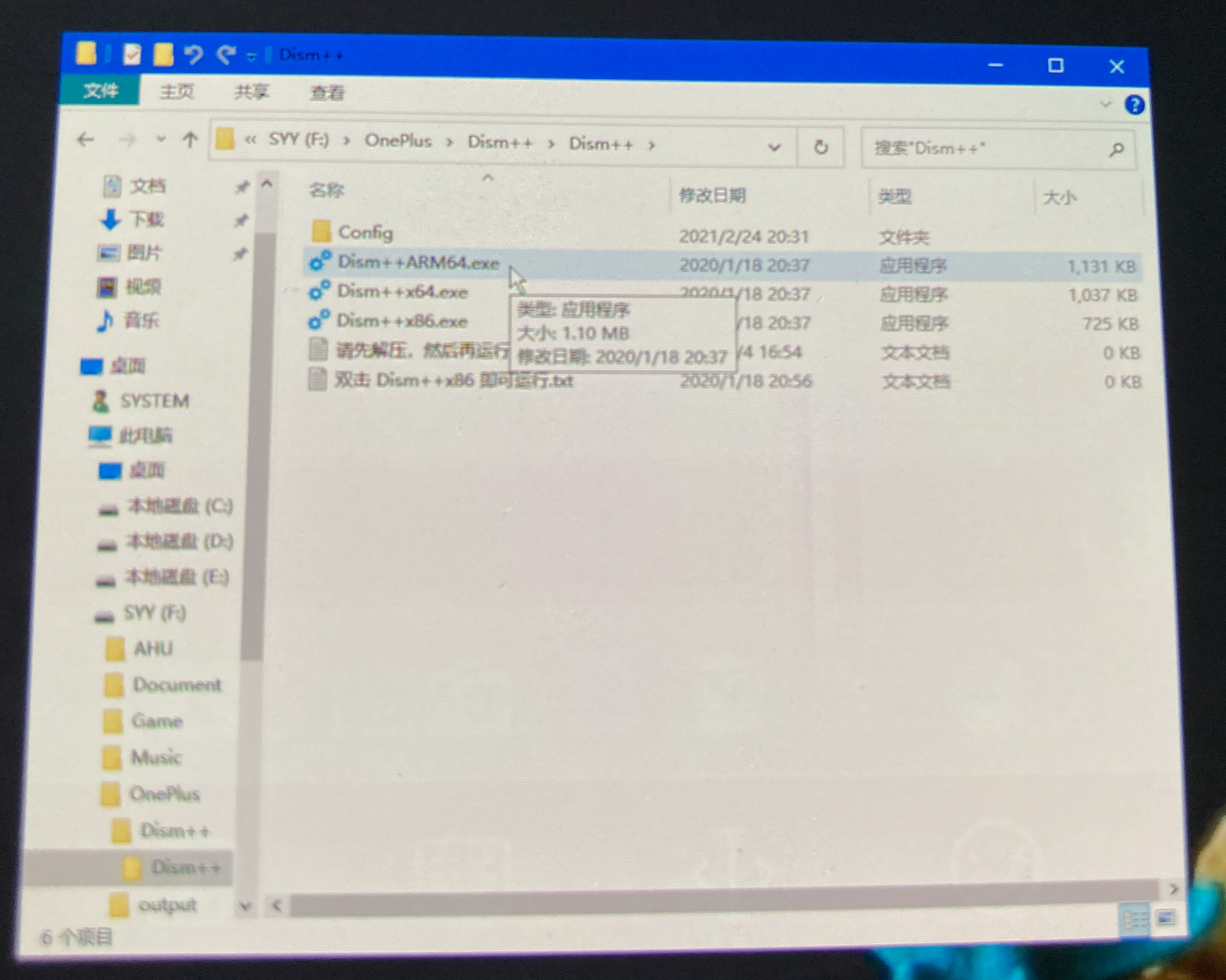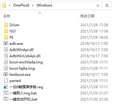 上述过程①中的一加6触摸屏修复.reg,③中的Dism++文件夹和解包得到的output驱动文件夹,④中得到的.ISO镜像文件,已经一个新建的.txt文本文档,文档内容为