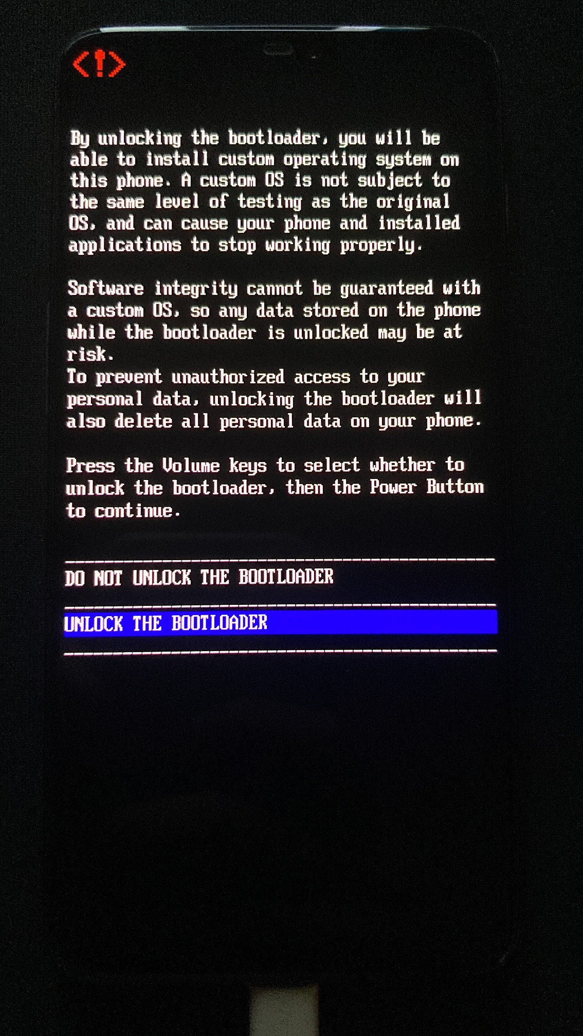 接下来手机应该会显示以下界面,按音量下键将高亮移动到UNLOCK THE BOOTLOADER,再按电源键以解锁,稍等片刻后手机会自动重启到安卓系统中