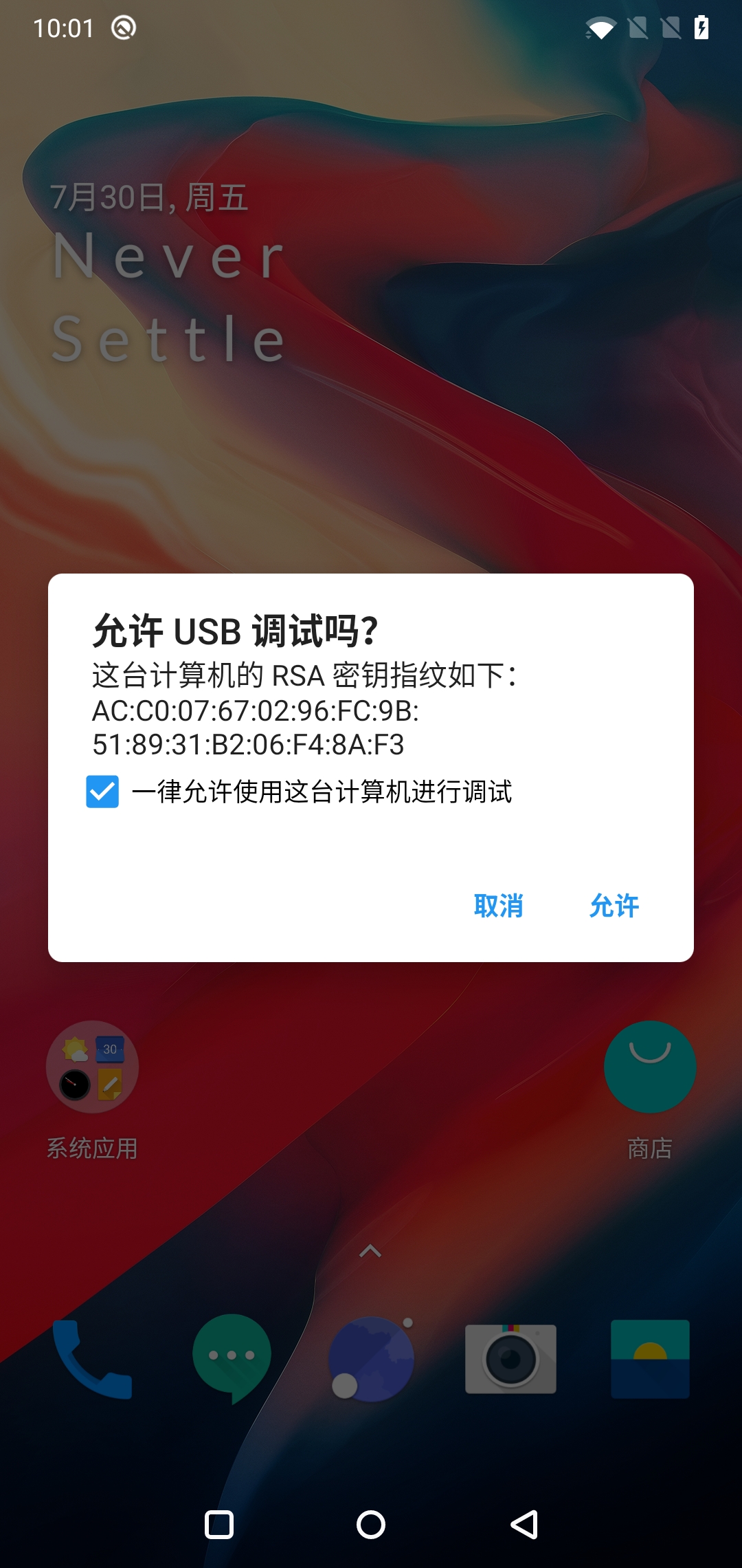 ④用数据线将手机与电脑连接,跳出提示框时勾选一律允许,点击允许