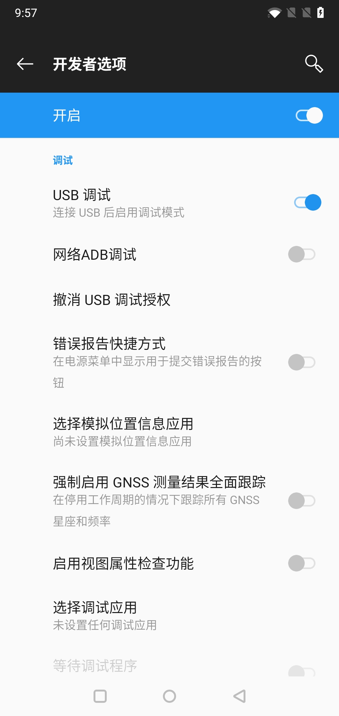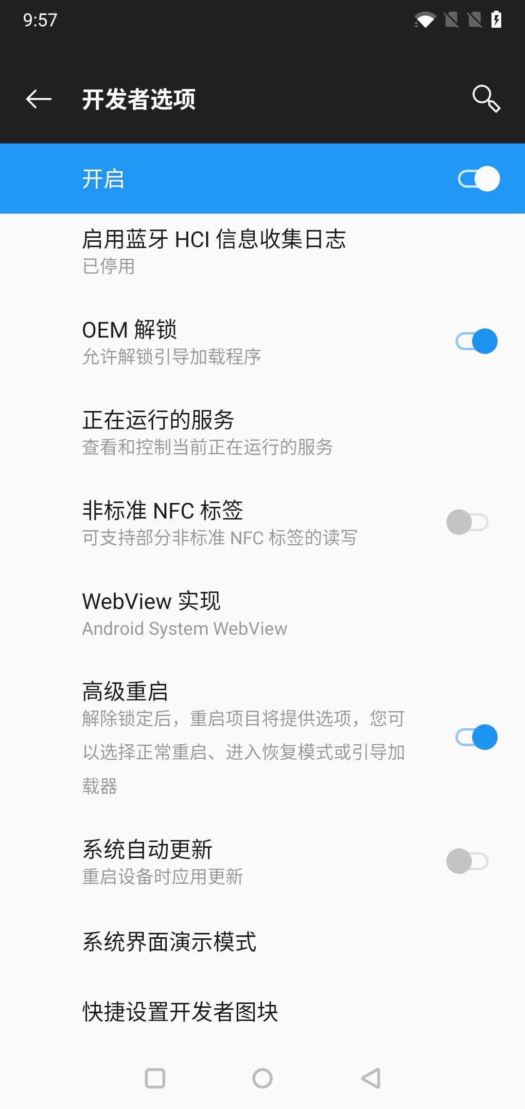 ③打开设置-系统-开发者选项,将OEM解锁,高级重启,USB调试这三项开启