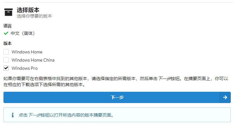 选择中文(简体),取消勾选Windows Home和Windows Home China,只保留Windows Pro,点击下一步