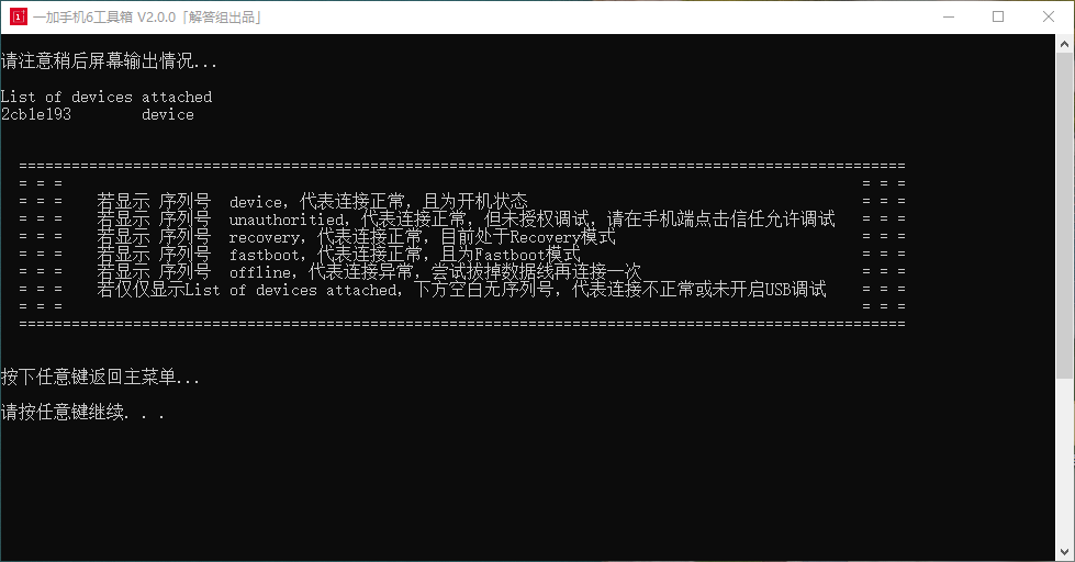 若显示其他异常代码,请先插拔数据线检查连接是否正常,再检查USB调试是否已开启,如果还是不正常请回到工具箱主菜单,输入1和2以安装相关驱动程序,直至显示手机连接正常