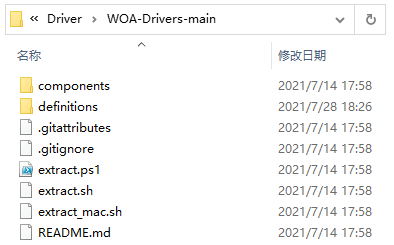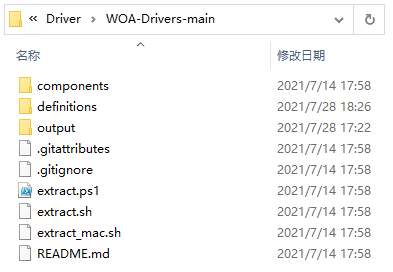 完成后会在文件夹中生成一个名为output的文件夹,这是最后解包得到的驱动程序,可以只保留此文件夹,WOA-Drivers-main文件夹中的其余文件不再需要