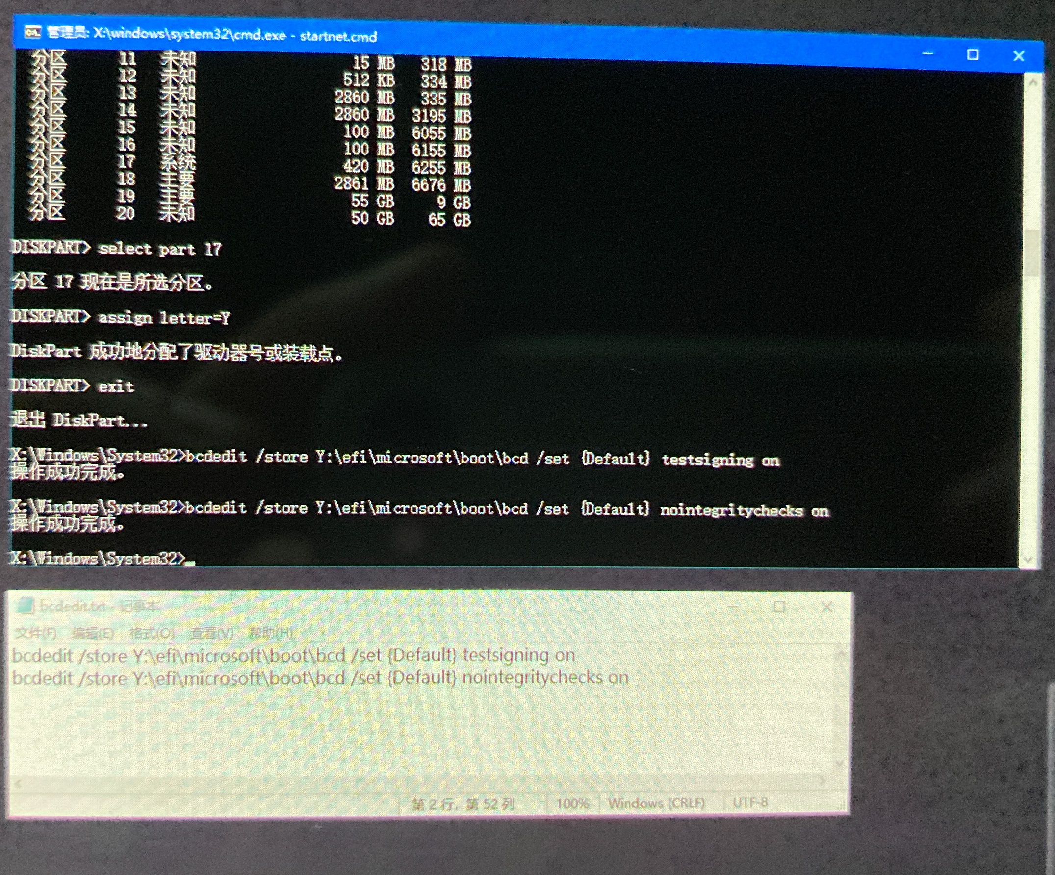 bcdedit /store Y:\efi\microsoft\boot\bcd /set {Default} testsigning on bcdedit /store Y:\efi\microsoft\boot\bcd /set {Default} nointegritychecks on此处可以使用存在U盘中的.txt直接复制粘贴,省去了手动输入的麻烦
