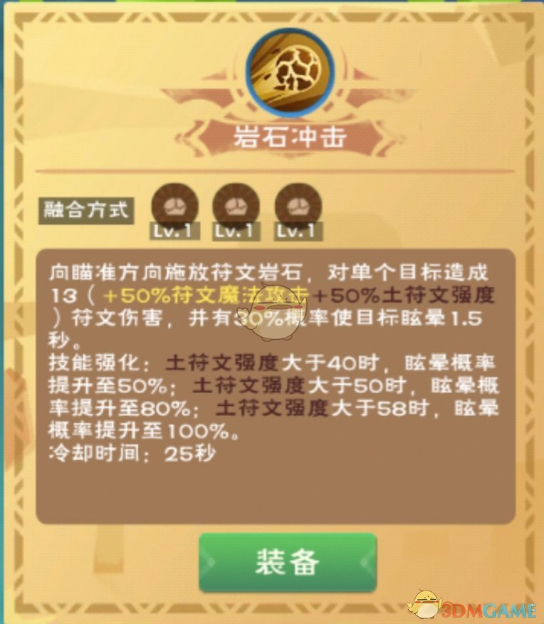 向瞄准方向释放符文岩石,对单个目标造成13(+50%符文魔法攻击+50%土符文强度)符文伤害,并有30%概率使目标眩晕1.5秒。