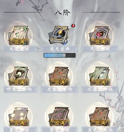 【星元秘法】十二层【紫霄真经】三层以上【太清道法】还有【星元秘法】和【紫霄真经】对大部分道友来说条件比较苛刻。此时解锁不了可以学习【无念禅经】12层有神通增减,主要是为快速激活九阶功法!