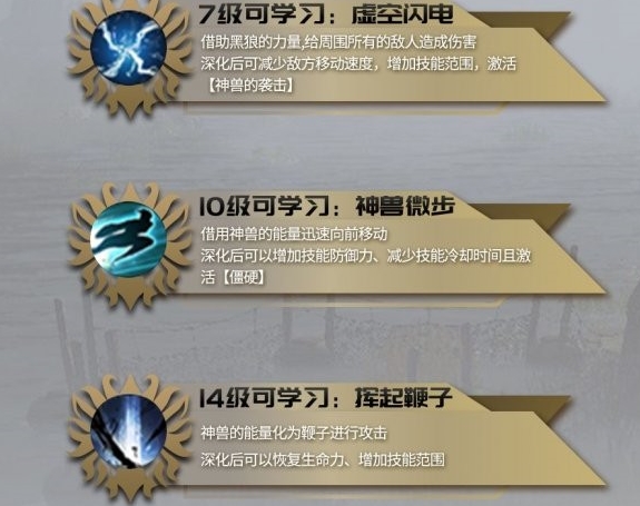 驯兽师和黑狼伤害比率50:50,使用技能后1.5秒内防御前方,吸引怪物。消耗精神力40,冷却时间14秒。