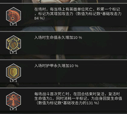 狗头:经过后土的加持后,此时的狗头已经有肉了,如图所示,本场有英雄死亡就会累计一个标记并且永久增加攻击力(随着等级的提高提升的攻击力会越来越高),而且会在第—次阵亡后复活,同时消耗一半标记回血(基础标记数值×131%)