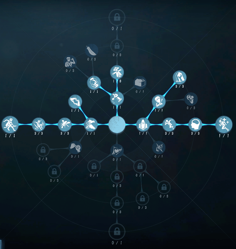 最常见的牵制位天赋之一,左路点满点出破窗理论和膝跳反射以通过交互获得加速效果,延长牵制时间。由于调酒师拥有底酒的关系,有机会持续和监管者保持距离;右路点满获得回光返照这个关键天赋;花费5点点出自愈获得自己爬起的机会;剩余35点可以自行选择,本处仅为常用参考。这里给出的是三层假寐降低救人位救援压力,一层爬行加速增加部分局势的容错率,以及幸存者本能弥补残局修机进度。