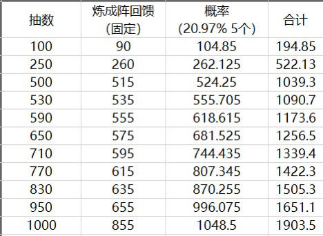 最近终于攒够沙子准备抽炼成阵,但看到沙子和用于兑换的全能之眼之间的数量关系还不是那么确定,就总结了一下抽不同数量可能获得的权能之眼: