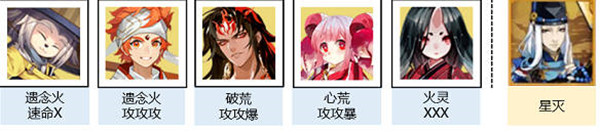 配速:鼠>食>修>蟹>其他;配置:晴明星灭;鼠 l 遗念火 l 速命X,技能无要求;食 l 遗念火 l 攻攻攻,满3技能;修 l 破荒 l 攻攻爆,满23技能;蟹 l 心荒 l 攻攻爆,3技能4级;座 l 火灵 l XXX,满2技能;设置:全员妖术说明:领兵一阶及以上可不带座敷,换成不知火或者驴妈等增伤,蟹姬可替换为其他群体输出,如阿修罗、饭笥、铃鹿御前、大天狗等。