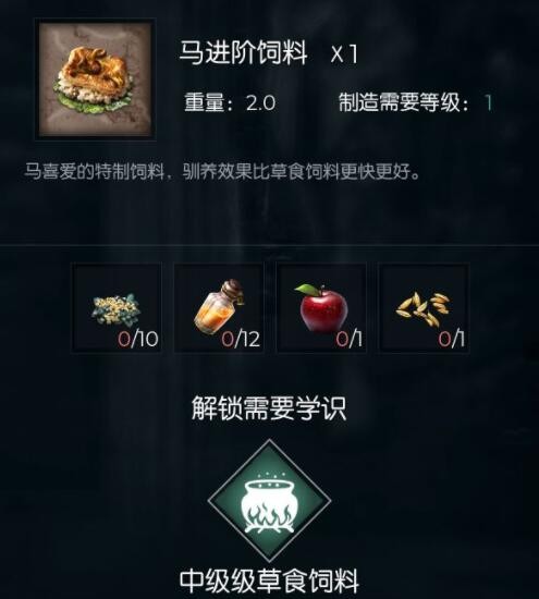 马:草饲料:450 野蜂蜜:540 苹果:45 草籽:45(前期推荐2.5分 特点很肉,跑的快)