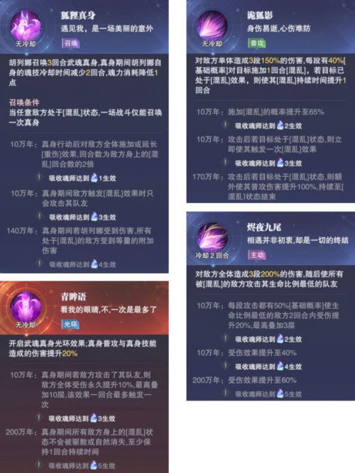 图中内容为胡列娜的狐狸真身所带来的四大效果,其中除了对【混乱】和【重伤】状态的相关衍生效果有特殊的功能外,这个武魂真身无疑最大的作用便是可以提升胡列娜在短图或长图中的增伤能力,并且这个增伤能力或许还会存在质变的可能性毕竟在真身光环里的这个每次10%,最多100%的永久敌方全体受伤增加的效果,对于我们的长图打伤害副本或许会有非常之大的增伤改观。