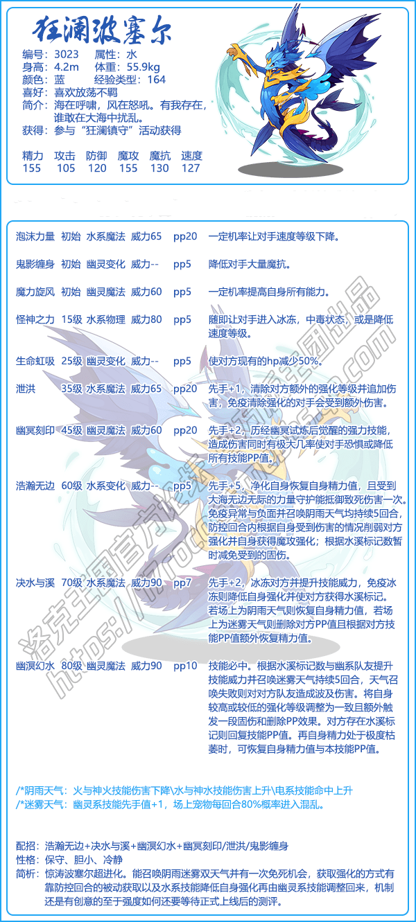 3、简析:惊涛波塞尔超进化。能召唤阴雨迷雾双天气并有一次免死机会,获取强化的方式有靠防控回合的被动获取以及水系技能降低自身强化再由幽灵系技能调整回来,机制还是有创意的至于强度如何还要等待正式上线后的测评。