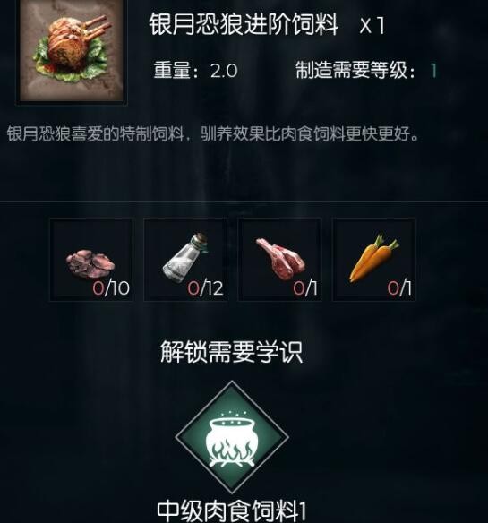 银月恐狼:肉饲料:450 盐:540 大角羊肉排:45 胡萝卜:45(前期推荐2.5分分身技能可以卡BOSS 采集技能:对动物尸体释放可以获得生肉)