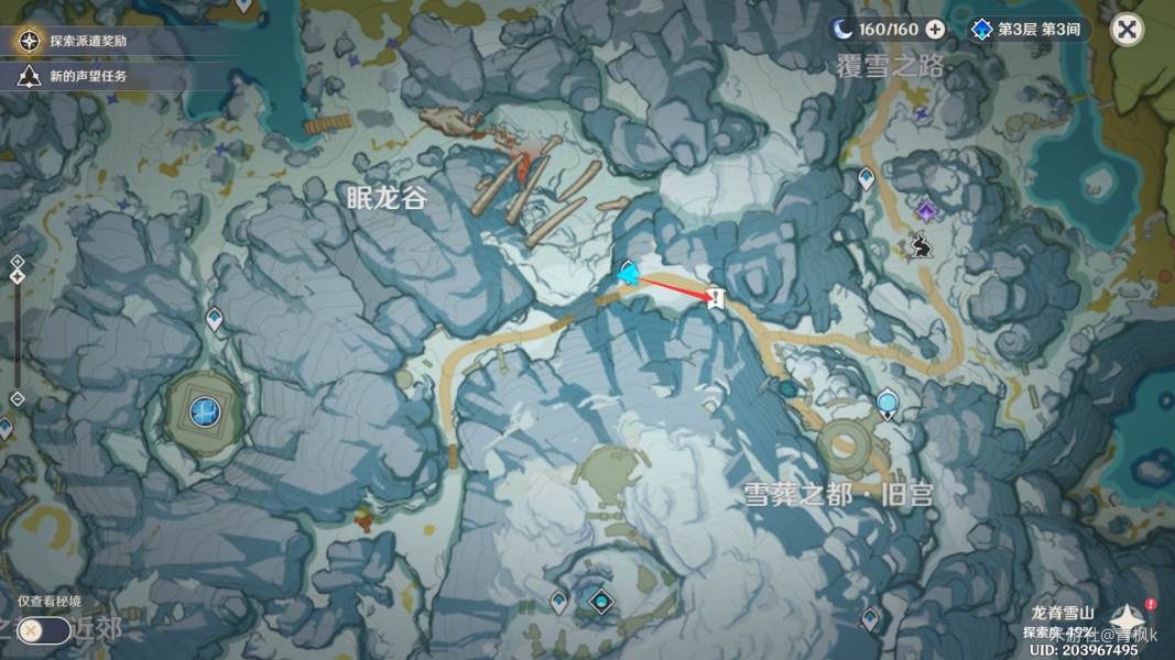 在完成雪山的前置任务〔雪山迷踪〕后,在图中标记处有一个调查点可以拿到《野猪公主·第六卷》