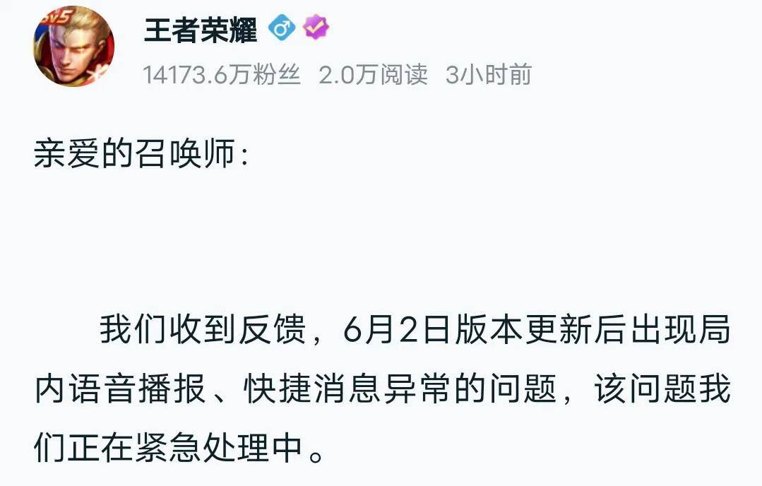 我们收到反馈,6月2日版本更新后出现局内语音播报、快捷消息异常的问题,该问题我们正在紧急处理中。