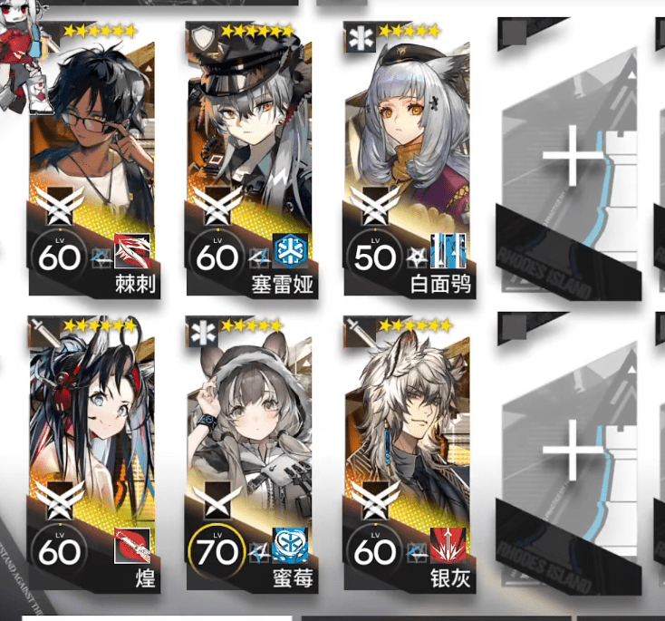 摆放方式如图所示,蜜莓→,棘刺↑,银灰↑,塞雷亚←,煌↑,白面鸮↑